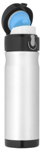 Light, compact travel bottle in silver holds 16 ounces; push-button drink lid for easy access and locking