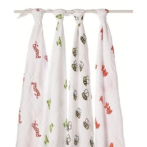 Pack of four 100% cotton muslin swaddling blankets. aden & anais wraps are the ultimate in breathability and softness. The fabric's light, open weave allows a baby's body temperature to regulate itself naturally in order to prevent overheating, so that a swaddled baby stays cool in the summer and warm in the winter. It is gentle on baby's skin and durable for everyday use, as the more you wash it, the softer it gets. aden & anais wraps are a generous size, measuring 47" x 47", so that new and seasoned moms alike can swaddle babies of all sizes with ease. In addition to the common use as a swaddling wrap, aden & anais wraps are versatile, useful as burp cloths, nursing shields, stroller covers to protect from sun, cold, wind or insects, portable crib sheets, stroller and car seat liners, tummy time blankets, change table covers, and more.