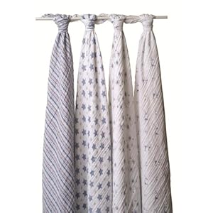 Pack of four 100% cotton muslin swaddling blankets. aden & anais wraps are the ultimate in breathability and softness. The fabric's light, open weave allows a baby's body temperature to regulate itself naturally in order to prevent overheating, so that a swaddled baby stays cool in the summer and warm in the winter. It is gentle on baby's skin and durable for everyday use, as the more you wash it, the softer it gets. aden & anais wraps are a generous size, measuring 47" x 47", so that new and seasoned moms alike can swaddle babies of all sizes with ease. In addition to the common use as a swaddling wrap, aden & anais wraps are versatile, useful as burp cloths, nursing shields, stroller covers to protect from sun, cold, wind or insects, portable crib sheets, stroller and car seat liners, tummy time blankets, change table covers, and more.